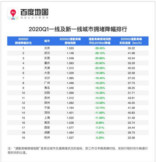据《报告》显示,2020年第1季度(1月1日-3月31日),受新冠肺炎疫情影响,全国重点城市道路交通拥堵水平均出现不同程度下降。在全国19个一线及新一线城市中,共有15个城市的2020年第1季度通勤高峰拥堵指数环比2018第四季度下降10%以上,其中,北京以-26.45%的降幅位列降幅榜第一,武汉、东莞、重庆、天津则以环比降幅高于20%的数据依次位列第二至第五。