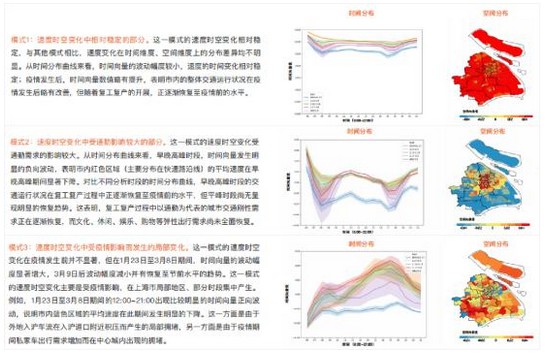 《报告》显示,基于百度地图提供的数据与工具支撑,同济大学研究团队对上海市重点交通片区疫情发生前后的拥堵状况做了对比分析,并通过将上海市的复工复产阶段划分为五个分析时段,构建出反映交通运行状况的时空变化矩阵,并根据奇异值的数值大小提炼出三个最为主要的速度时空变化模式,系统呈现并分析复工复产前后上海交通运行状况与变化趋势。